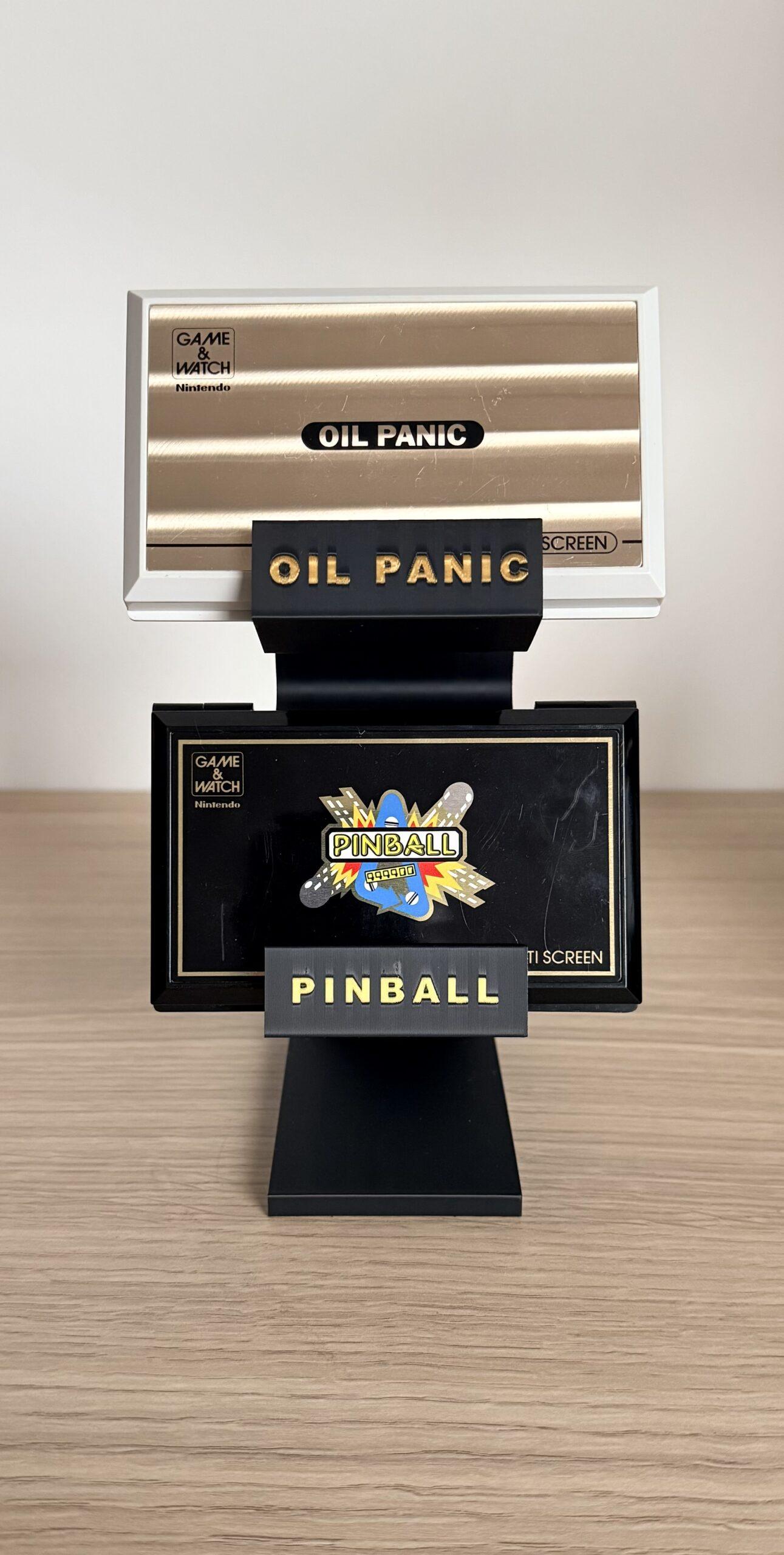 Ce présentoir vertical permet de mettre en valeur deux consoles simultanément (comme les mythiques Oil Panic, Donkey Kong ou Pinball) tout en optimisant l’espace sur vos étagères.